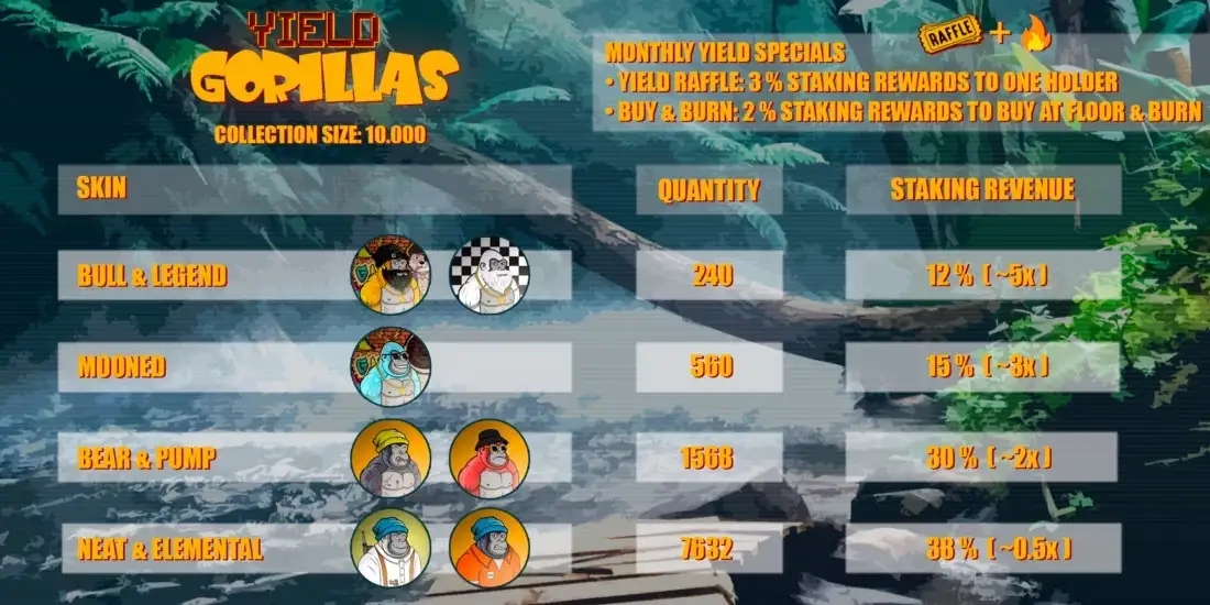 The revenue from the mint orignally got staked on GATA validators, then sent to GATA Yield for % representation in GATA Yield DAO. The rewards collected from staking & DeFi activities are distributed to the holders of Yield Gorillas on a monthly epoch, based on the rarity of their YGs.